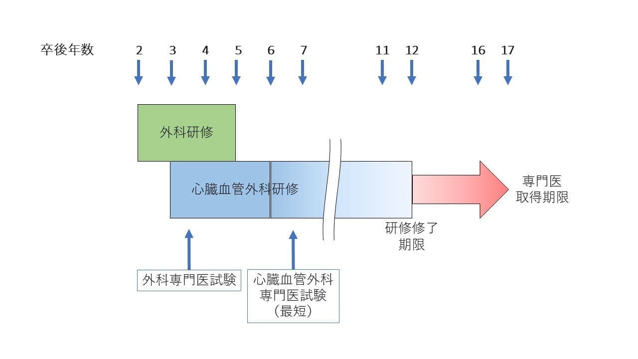 心臓血管外科専門医取得までに最低、卒業後8年、初期臨床研修終了後6年必要です。